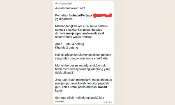 "Mohon berpesan kepada anak-anak untuk tidak mempercayai atau mengikut orang yang tidak dikenali. Jika tuan puan mengalami masalah untuk menjemput awal boleh hubungi pejabat atau guru kelas untuk perkhidmatan transit kami," kata satu peringatan yang diterima ibu bapa di sebuah sekolah di Kota Bharu, hari ini.