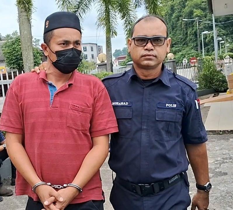 Mohd. Norzaizhul (kiri) didenda RM1,200 atas kesalahan menampar pelajar tahfiznya di Mahkamah Majistret Kemaman hari ini.