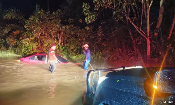 Empat sekeluarga nyaris maut selepas kereta dinaiki terbabas ke dalam longkang ketika mereka cuba meredah air banjir yang melimpah di Jalan Tersan, dekat Raub, Pahang, awal pagi tadi.